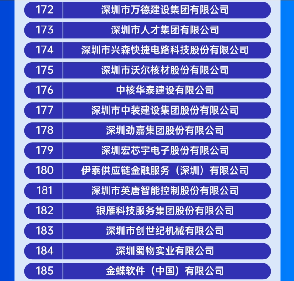 9月25日,深圳市企業聯合會、深圳市企業家協會正式發布“2023深圳企業500強榜單”及《2023深圳500強企業發展報告》,作為中國建筑裝飾企業的領軍企業,中裝建設憑借在業務領域發展成果和社會貢獻,以及品牌良好的社會聲譽,蟬聯2023深圳企業500強,位列177名。