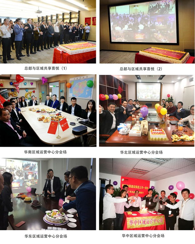 遠程共享,歡喜同賀。中裝建設華南區域運營中心、華北區域運營中心、華中區域運營中心、華東區域運營中心、青島分公司等分會場與集團總部遠程視頻、共同慶祝中裝建設上市一周年。